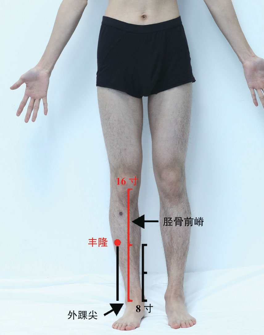 正坐或仰卧位点穴,以髌韧带外侧凹陷和胫骨前嵴为定位标志。髌韧带位于髌尖正下方,内外两侧各有一明显凹陷,下肢曲膝90°时,此凹陷易于显现。胫骨前嵴为胫骨前缘,在皮下易于触及,形似嵴状,穴在胫骨前嵴外一横指。此处髌韧带外侧凹陷下8寸以髌尖到外踝尖的直寸值为量取标准。将髌尖至外踝尖之16寸平均分为2段,每段8寸,上下两段交界处即为髌韧带外侧凹陷下8寸。(图5-47)