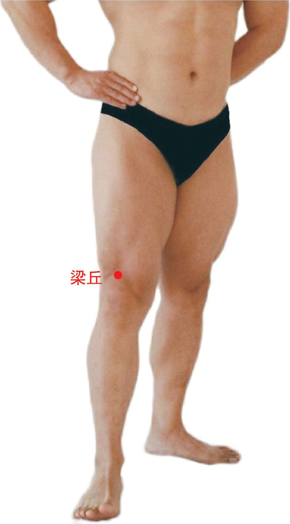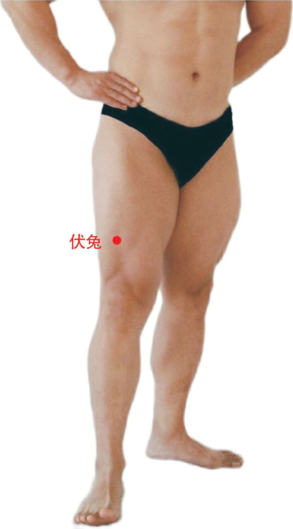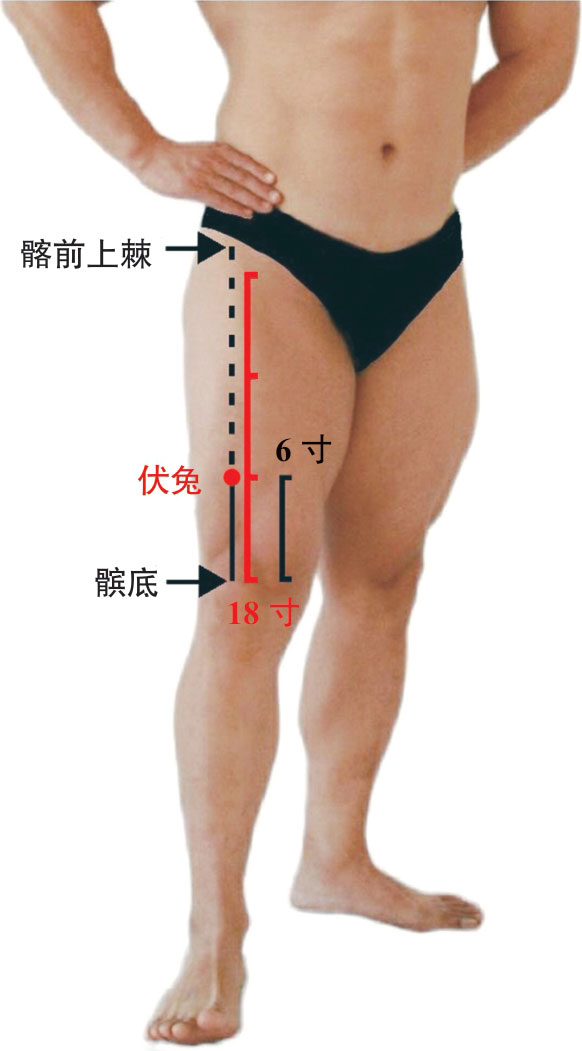 仰卧,下肢伸直,足尖用力向前屈,可见膝上股前有一肌肉(股直肌)隆起,状如伏兔,这一肌肉的中点即是本穴。(图5-39)