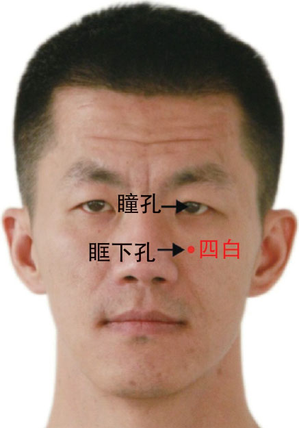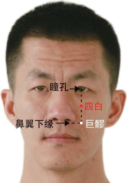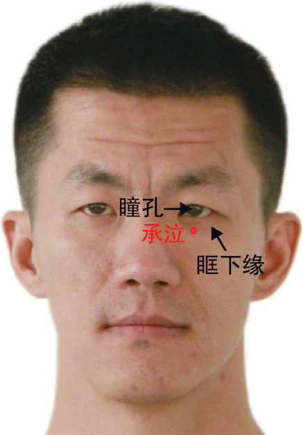 坐位或仰卧位点穴,以瞳孔和鼻翼下缘为定位标志。鼻翼为鼻尖两侧呈弧形隆起的部分。点穴时需保持目正视,使瞳孔的位置居于眼睛正中间。瞳孔直下的垂线与鼻翼下缘的水平线之交点即为本穴。(图5-4)