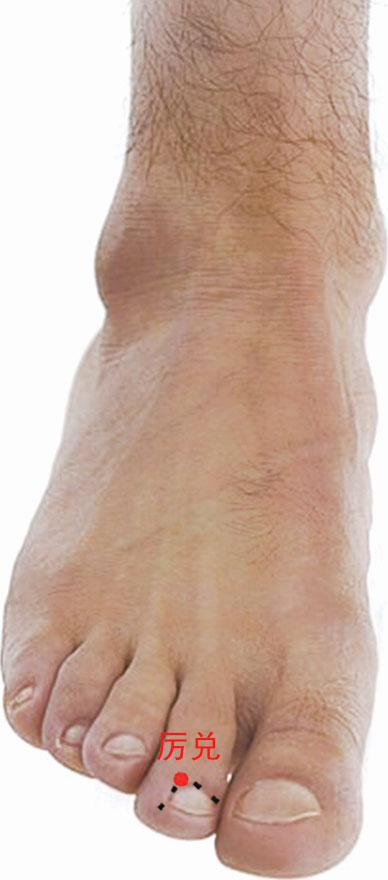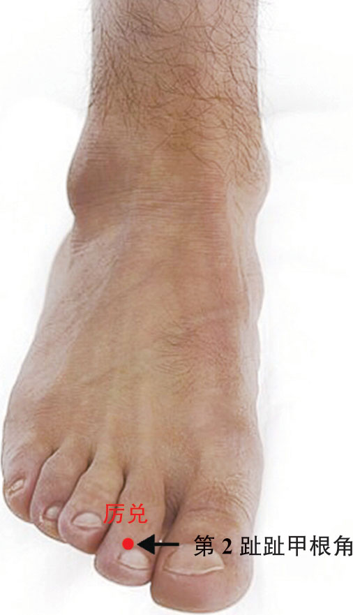 在足趾,第2趾末节外侧,趾甲根角后方0.1寸。