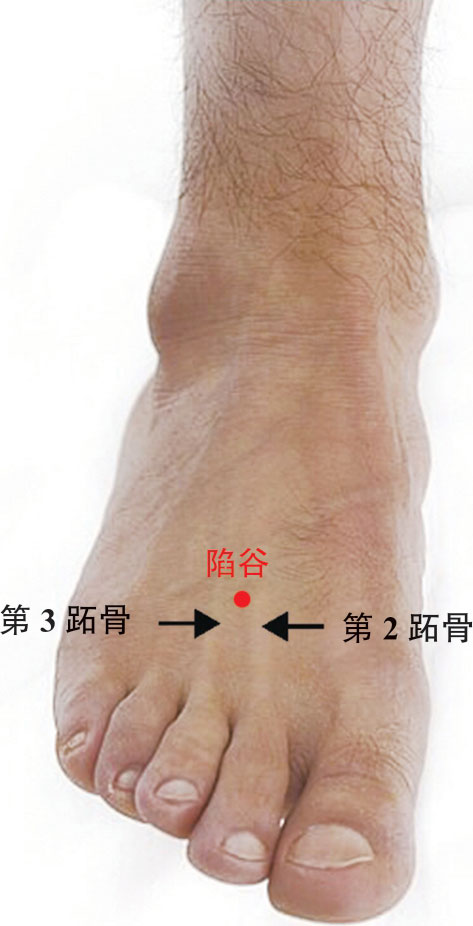 正坐或仰卧位点穴,以第2、3跖骨结合部为定位标志。各跖骨远心端称为跖骨头,分别与相邻跖骨相连接,握紧全部足趾使之跖屈,各跖骨头即可充分突出,在足背部可清楚看到各跖骨头突出于皮下,穴在第2、3跖骨头结合部的前方凹陷中。(图5-52)