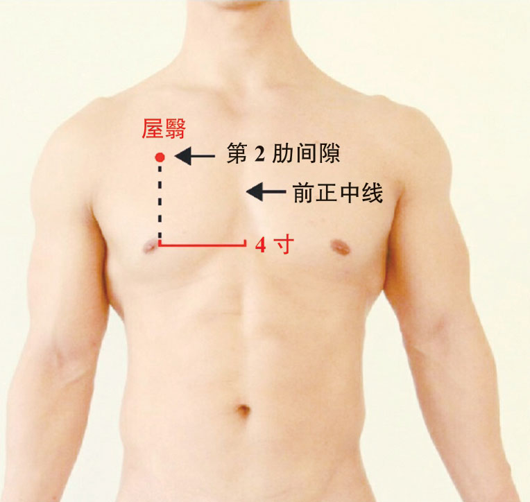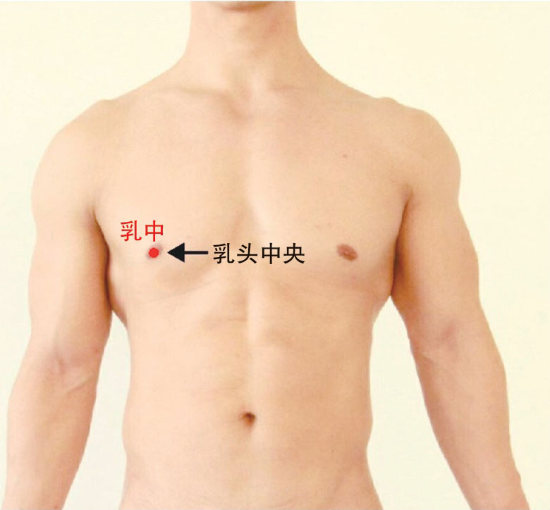 正坐或仰卧位点穴,以第2肋间隙和前正中线为定位标志。第2肋间隙为第2肋骨与第3肋骨之间的间隙。胸骨角两端是第2肋骨与胸骨的连接点,平对第2肋骨,可先于胸骨角水平确定第2肋骨,其下即为第2肋间隙。对不易看到或触到肋骨的人,可令其做快速、重复的吸气动作,以抬高肋骨,便于触及。此处4寸以前正中线到乳晕内缘的横寸值为量取标准。先将前正中线至乳晕内缘之4寸自前正中线沿第2肋间隙平移,终点即为本穴。(图5-21)