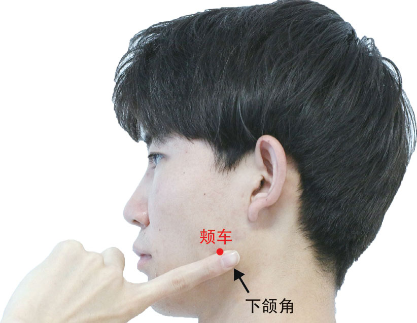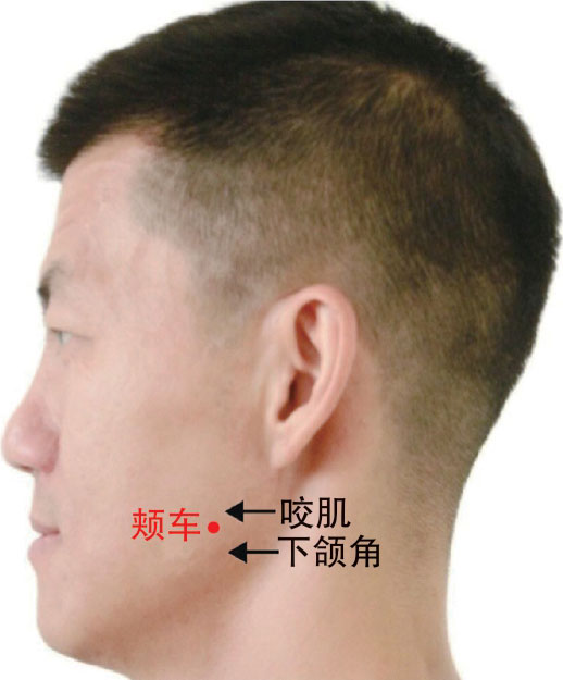 坐位或仰卧位点穴,用力咬紧牙齿,以下颌角和咬肌为定位标志。下颌角是面部下段的角状骨性结构,为下颌骨升支部后缘与下颌体下缘相交处,上面附着咬肌的止点,用力咬紧牙齿时,在下颌角处能明显看到隆起的咬肌,男子比女子明显,不明显时,可将手指横放在上颌角处,同时做咬紧和放松牙齿的咬合动作,指腹能很明显感到咬肌的运动。本穴在咬肌隆起处顶点。(图5-8)