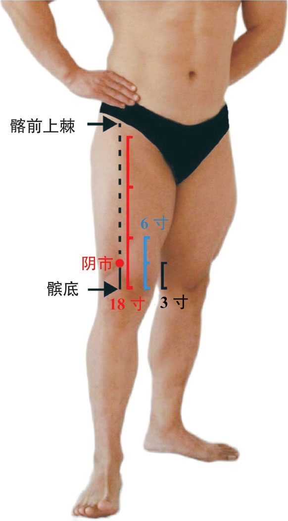 坐位或仰卧位点穴,以髌底与髂前上棘为定位标志。髂嵴的前端为髂前上棘,仰卧位时,下肢平伸或下肢搭于床沿外下垂,可见腹股沟外侧高高隆起的骨性突起,即为髂前上棘,易于触及。髌骨为膝关节前方皮下三角形的扁平骨,屈伸膝关节时随之移动,底朝上为髌底。此处3寸以耻骨联合上缘到髌底的直寸值为量取标准。先将耻骨联合上缘至髌底的18寸平均分为3段,每段6寸;再将下段6寸平均分成2段,每段3寸,将此3寸自髌底外侧端沿髂前上棘与髌底外侧端的连线上移,终点即为本穴。(图5-40)