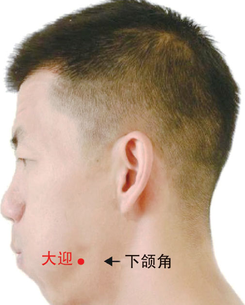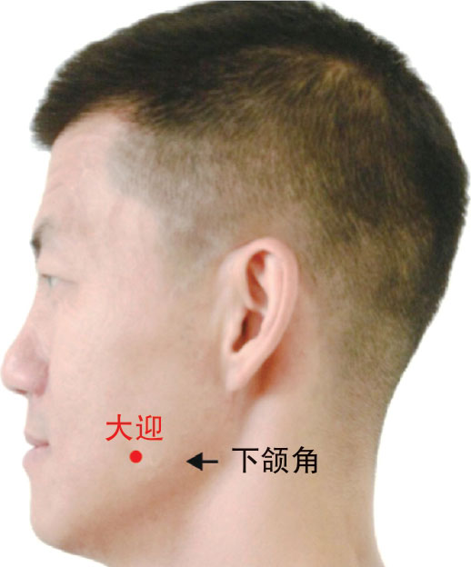 闭口鼓腮,在下颌骨下颌体靠近下缘处,可见一凹沟,手指横放于此凹沟,稍微用力按之有动脉搏动处即是本穴。(图5-7)