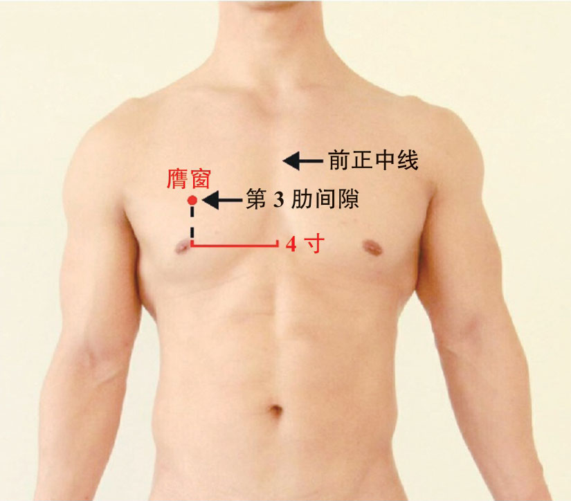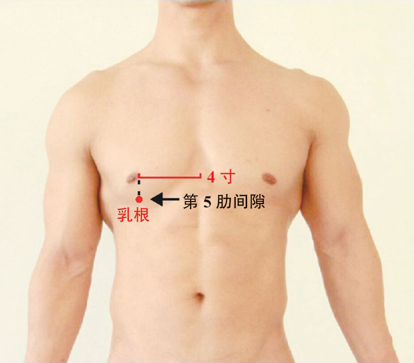 正坐或仰卧位点穴,以第3肋间隙和前正中线为定位标志。第3肋间隙为第3肋骨和第4肋骨之间的间隙。第3肋骨以第2肋骨为定位依据。先于胸骨角水平确定第2肋骨,自第2肋骨向下循摸到的第1个肋骨为第3肋骨,其下为第3肋间隙。对不易看到或触到肋骨的人,可令其做快速、重复的吸气动作,以抬高肋骨,便于触及。男子第3肋间隙为乳头直上的第1个肋间隙。此处4寸以前正中线到乳晕内缘的横寸值为量取标准。先将前正中线至乳晕内缘之4寸自前正中线沿第3肋间隙平移,终点即为本穴。(图5-22)