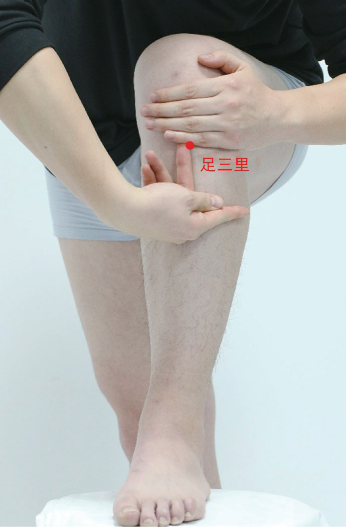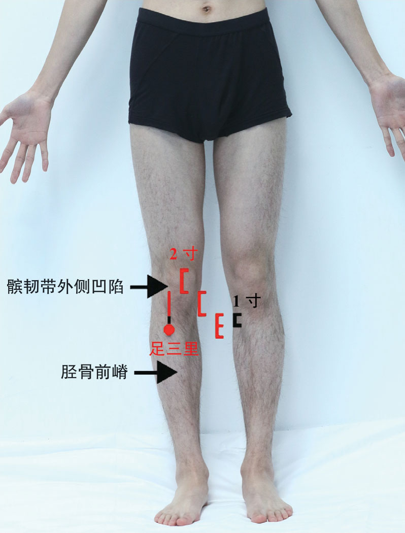 正坐或仰卧位点穴,屈膝,以髌韧带外侧凹陷和胫骨前嵴为定位标志。髌韧带位于髌尖正下方,内外两侧各有一明显凹陷,下肢曲膝90°时,此凹陷易于显现。此处3寸以髌底到髌尖的直寸值为量取标准。将骶底至髌尖之2寸自髌韧带外侧凹陷向下垂直平移2次,再将下段2寸平均分为2段,上下两段中点即为髌韧带外侧凹陷下3寸。胫骨前嵴为胫骨前缘,在皮下易于触及,形似嵴状,穴在胫骨前嵴外一横指。(图5-44)