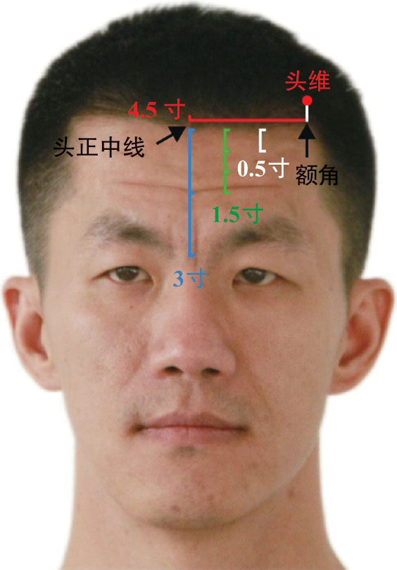 正坐、仰靠或仰卧位点穴,以额角和头正中线为定位标志。此处前发际直上0.5寸以两眉中点到前发际的直寸值为量取标准,先将两眉中点到前发际的3寸平均分为2段,每段1.5寸;再将上段1.5寸平均分为3段,每段0.5寸,将此0.5寸沿额角前发际处向上平移,即为前发际直上0.5寸。头正中线旁开4.5寸以两额角之间的横寸值为量取标准。额角是前额两侧发际所形成的角,两角之间的距离为9寸,前正中线旁开4.5寸为额角纵向发际边缘处。(图5-12)