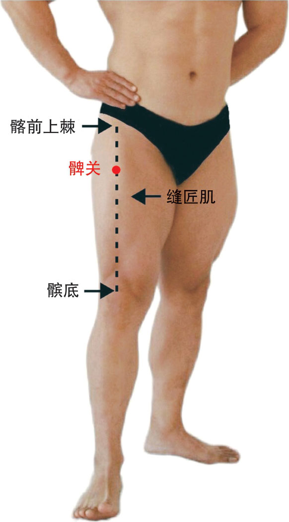正坐位或仰卧位点穴,以髂前上棘、髌底、会阴与缝匠肌为定位标志。髂嵴的前端为髂前上棘,仰卧位时,下肢平伸或下肢搭于床沿外下垂,可见腹股沟外侧高高隆起的骨性突起,即为髂前上棘,易于触及。髌骨为膝关节前方皮下三角形的扁平骨,屈伸膝关节时随之移动,底朝上为髌底。从髂前上棘高点至髌底外侧端划一连线,穴在该线平会阴的交点上,此线在髀关处与缝匠肌的外缘重合。会阴是人体部位名称,界线由耻骨联合下极、耻骨弓、坐骨结节、骶结节韧带和尾骨所围成。缝匠肌为扁带状长肌,位于大腿前方和内侧皮下,髋关节前屈、旋外、外展位时,可在大腿内侧看到隆起的带状缝匠肌,穴在该肌外侧。(图5-37)