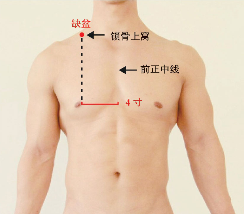 正坐仰靠位或仰卧位点穴,以锁骨上窝和前正中线为定位标志。锁骨上窝又名锁骨上大窝,在颈外侧区,是位于锁骨中段后方的一个三角形凹陷,界线为锁骨外侧缘、胸锁乳突肌外侧缘和肩胛舌骨肌下腹下缘,在锁骨后方容易看到或触及,穴在锁骨上窝内锁骨上缘处。此处4寸以前正中线到乳晕内缘的横寸值为量取标准。先将前正中线至乳晕内缘之4寸自前正中线沿锁骨上缘平移,终点即为本穴。(图5-17)