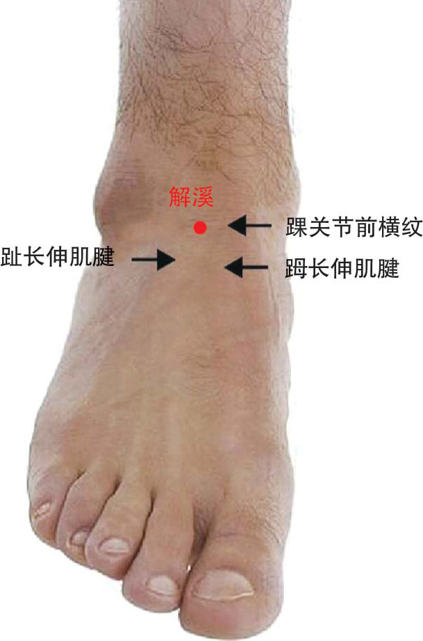 长伸肌腱与趾长伸肌腱为定位标志。足跟着地,足尖向上时,踝关节前横纹明显显现,穴在踝前横纹中央凹陷中。足跟着地,足尖用力向上,给一阻力向下压足尖时,在