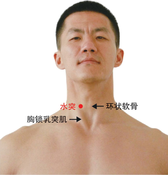 正坐仰靠或仰卧位点穴,以环状软骨与胸锁乳突肌为定位标志。环状软骨形如指环,构成喉的底座,位于喉结的下方。胸锁乳突肌位于颈部两侧皮下,是颈部诸多肌肉中最大、最粗的一条,当头稍低向一侧转动时,对侧胸锁乳突肌即明显隆起。仰卧位时去枕,将头转向对侧,胸锁乳突肌更易明显显露,穴在胸锁乳突肌前缘。(图5-15)