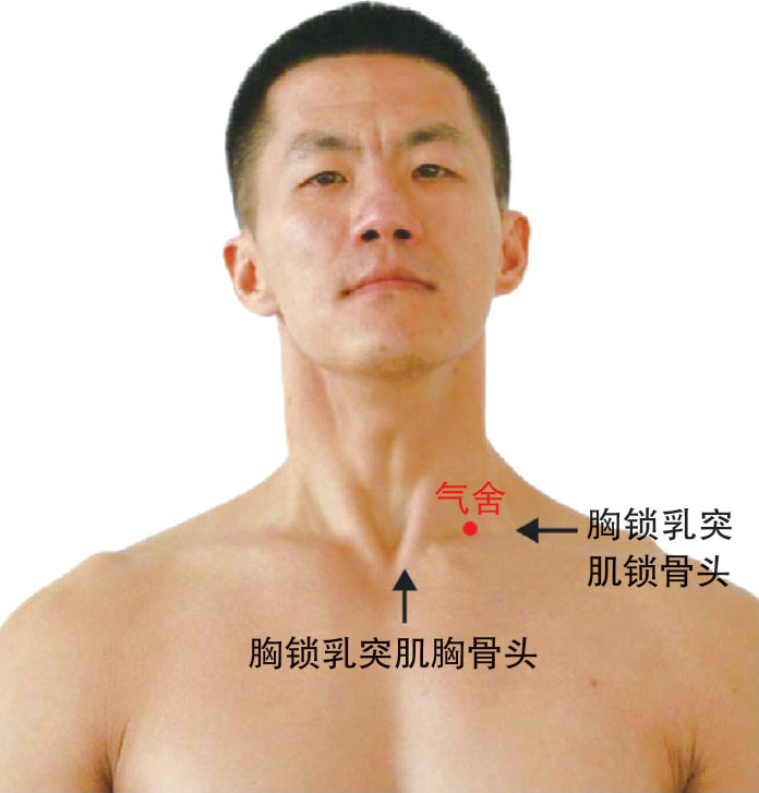 正坐仰靠位或仰卧位点穴,以锁骨胸骨端和胸锁乳突肌为定位标志。锁骨在皮下易于触及,自锁骨中部明显的骨干部分向内侧循摸,可触及明显突出的锁骨胸骨端,穴在锁骨胸骨端的上缘。胸锁乳突肌起于胸骨柄前面和锁骨上缘内1/3处,当头用力向一侧倾斜时,给一阻力对抗使面部转向对侧,则该侧胸锁乳突肌隆起明显,可轻易看到或触到胸锁乳突肌的胸骨头和锁骨头,穴在两肌头之间的凹陷中。(图5-16)