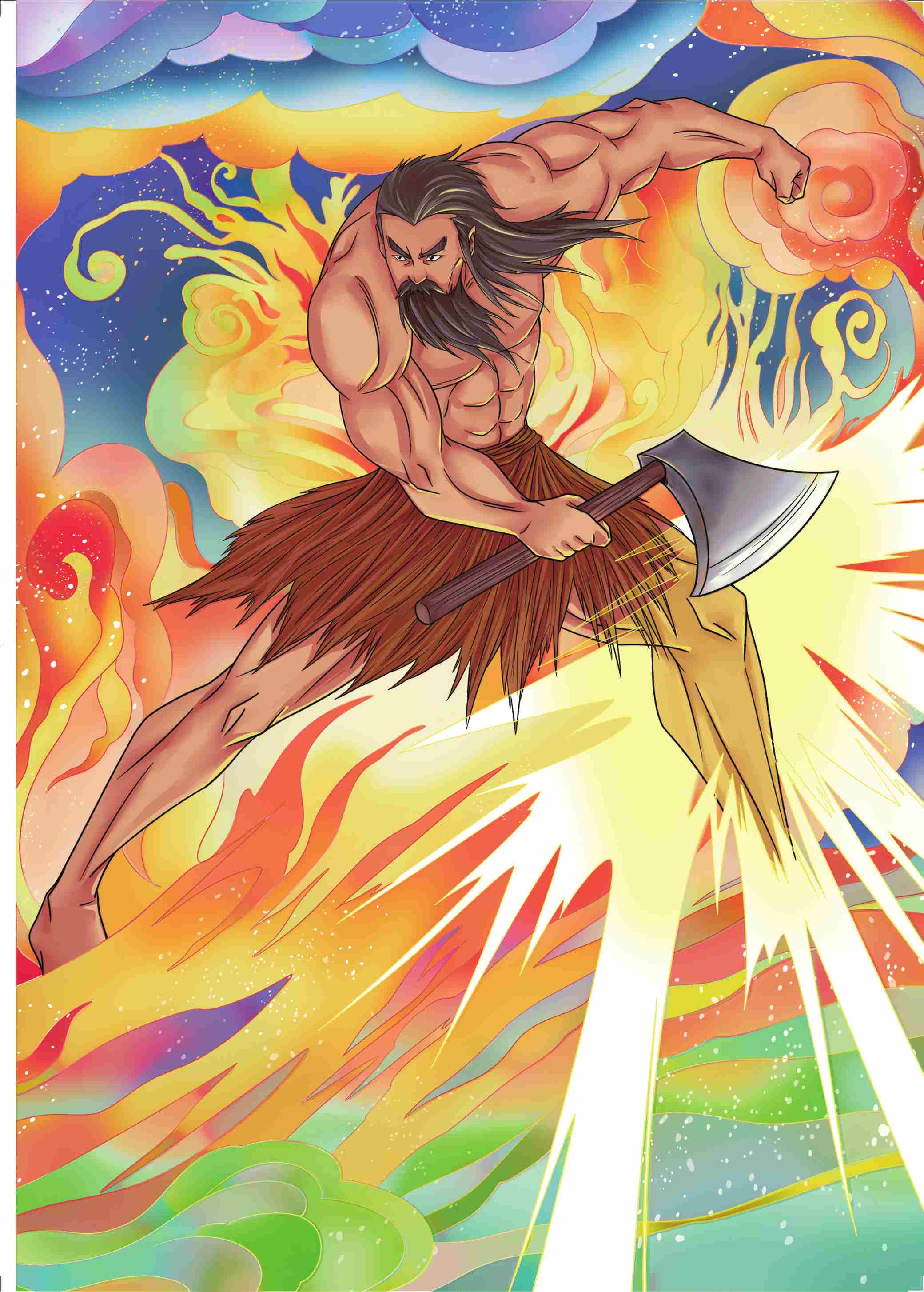 有一天,盘古突然醒了。他见周围一片漆黑,就抡起大斧头,朝眼前的黑暗猛劈过去。只听一声巨响,混沌一片的东西渐渐分开了。轻而清的东西缓缓上升,变成了天;重而浊的东西慢慢下降,变成了地。天和地分开以后,盘古怕它们还会合上,就头顶着天,脚使劲蹬着地。天每天升高一丈,地每日增厚一丈,盘古也随着越长越高。这样不知过了多少年,天和地逐渐成形了,盘古也累得倒了下去。