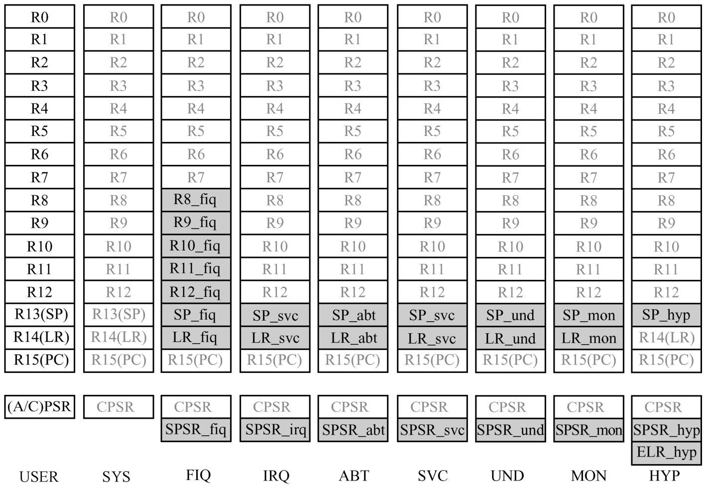 虽然软件可以访问寄存器,但是根据运行软件的模式和所访问的寄存器,一个寄存器可能对应不同的物理存储位置,这称为分组(Banking)。如图5.8所示,背景为灰色的寄存器被分组。它们使用物理区分保存方法,只有当进程在特殊模式下运行时才可访问它们。