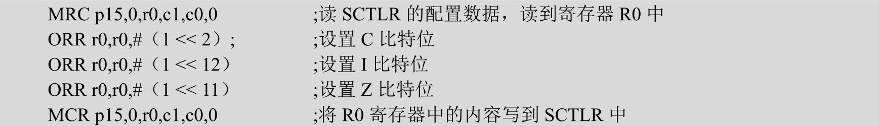启动代码序列的一部分用于设置CP15.SCTLR,使能分支预测,如代码清单5.2所示。