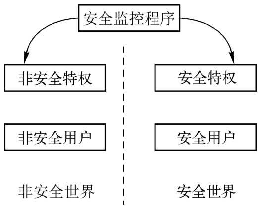在这种情况下,安全监控程序就相当于在两个世界直接来回移动的门槛。如果实现了TrustZone安全性扩展,则在监控模式下运行的软件控制处理器在安全和非安全状态之间切换。