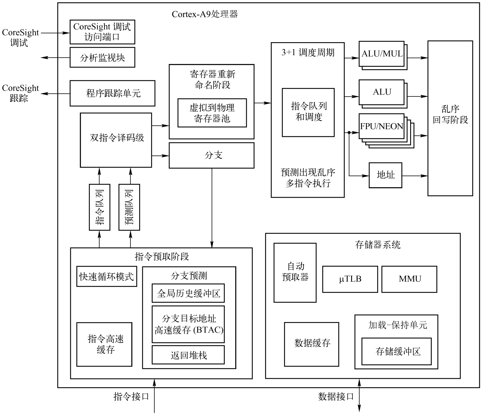 在Cortex-A9处理器内实现的流水线采用了高级取指和指令预测技术,可以避免由于存储器延迟引起指令的停止而影响分支指令的执行。在Cortex-A9处理器中,可以预先加载最多4个指令缓存行,用于减小存储器延迟对指令吞吐量的影响。在每个周期内,CPU取指单元能够向指令译码缓冲区连续发送2~4个指令,以保证高效地使用超标量流水线。CPU实现一个超标量译码器,用于在一个周期内对2个完整的指令进行译码。4个CPU流水线中的任何一个流水线都能从发布队列中选择指令。在每个周期内,并行流水线支持2个算术单元、加载和保存单元的并行执行,以及解析任何分支(跳转)。
