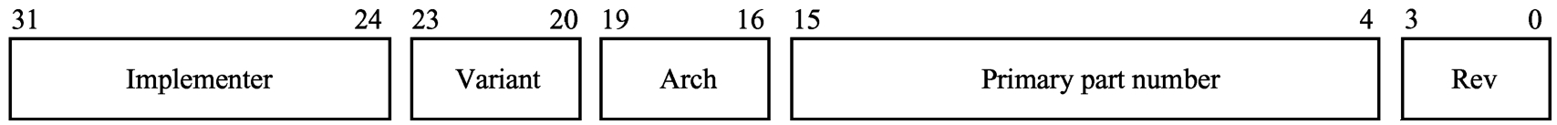 (1)[31:24]为制定者,对Arm设计的处理器来说,其值为0x41。