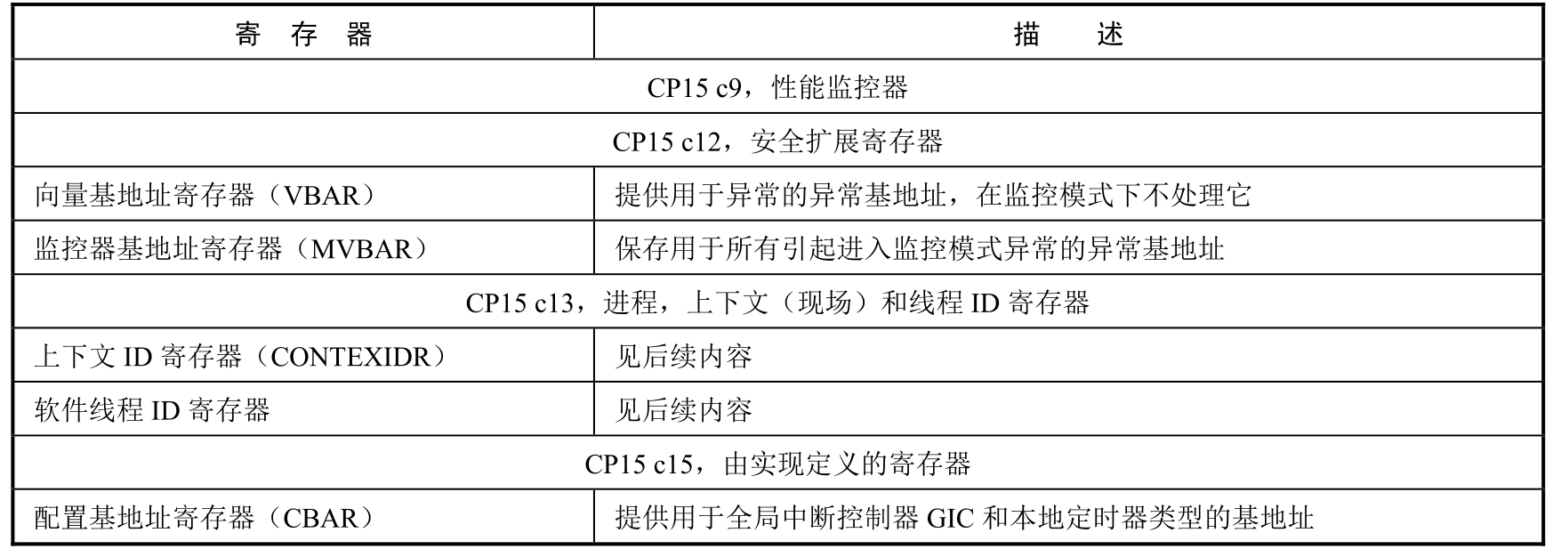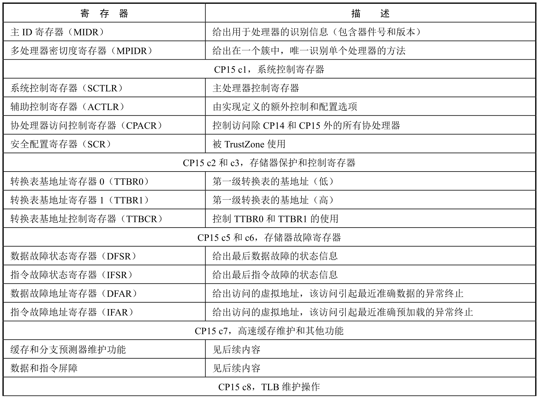 CP15称为系统控制协处理器,提供对CPU大量特性的控制能力。它包含最多16个32位的基本寄存器。访问CPU由特权控制,在用户模式下,有些寄存器不可使用。CP15寄存器访问指令指定要访问的基本寄存器,指令中的其他域用于更准确地定义访问及增加CP15内32位物理寄存器的数量。在CP15内,将16个32位的基本寄存器分别命名为c0~c15,但是经常用它们的名字作为参考,如CP15系统控制寄存器称为CP15.SCTLR。