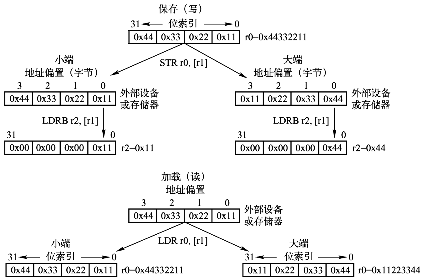 现代的Arm处理器支持一个大端格式,其架构被称为BE8,只应用于数据存储器系统。以前的Arm处理器使用不同的大端格式,其架构被称为BE-32,应用于数据和指令。