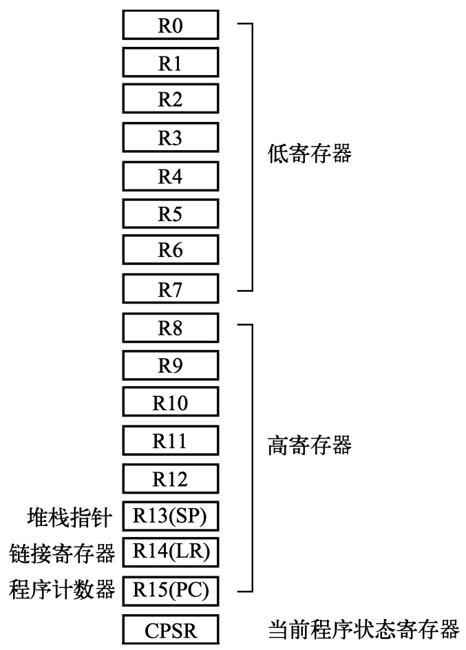 在任何时刻,软件都可以访问16个寄存器(R0~R15)及CPSR。在用户模式下,访问CPSR的一个限制形式称为应用程序状态寄存器(Application Program Status Register,APSR)。