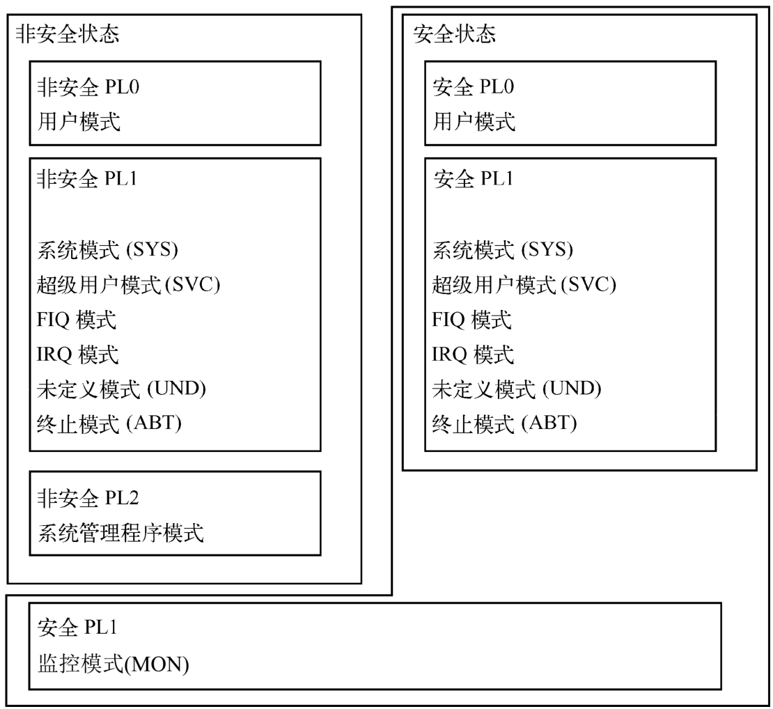 如果实现了虚拟化扩展,则此处的特权模式不同于前面的结构。在非安全世界中,有3个特权级,即PL0、PL1和PL2。