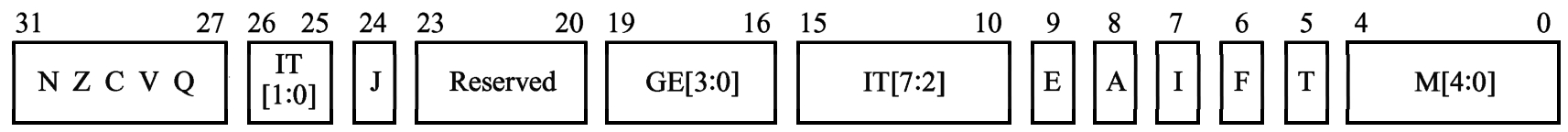 当前状态寄存器用于保存APSR标志、当前处理器的模式、中断禁止标志、当前处理器的状态(Arm/Thumb/ThumbEE/Jazelle)、端、用于IT块的执行状态位。