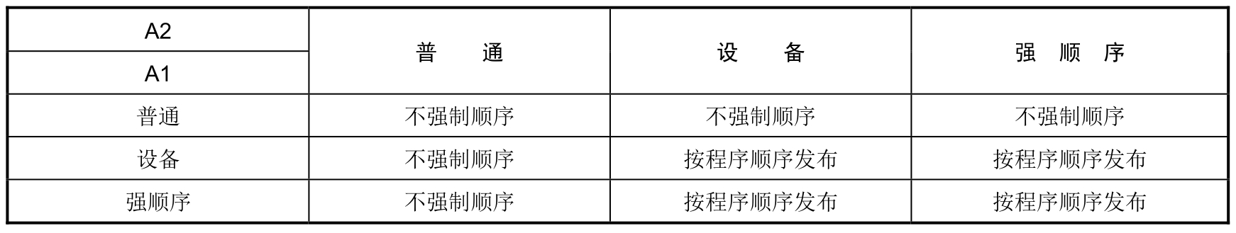 Cortex-A9结构定义了一套存储器属性,用于支持系统存储器映射中所有的存储器和设备。下面的互斥主存储器属性描述了存储器区域:普通、设备和强顺序。对普通存储器来说,可以指定存储器是否可以共享,以及内部和外部的可缓存属性。对于A1和A2这两个访问,如果没有地址重叠,则在程序代码中,A1发生在A2之前,但是写可以无序发布,如表6.1所示。