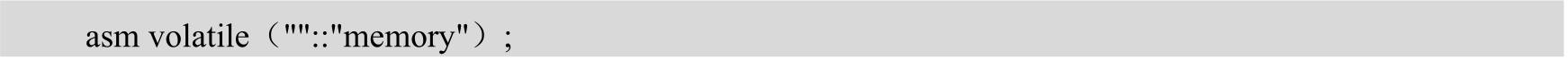 术语屏障又指编译器机制,当执行优化时,它阻止编译器调度数据访问指令穿越屏障。例如,在GCC内,程序员可以使用内联汇编器存储器“敲打”(Clobber),用于说明指令修改存储器,因此优化器不能跨越屏障对存储器的访问进行重新排序,语法如下: