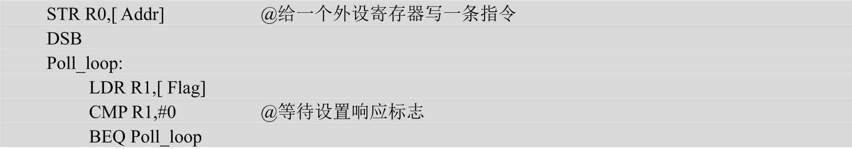 没有使用屏障指令而可以引起死锁的情况是处理器核写一个地址,并轮询一个外设给出的响应值,如代码清单6.7所示。