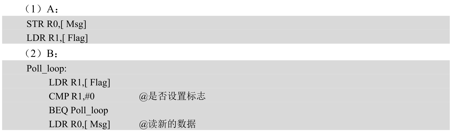 考虑下面的情况:B先查找由A设置的标志控制,然后读取存储器。例如,如果将消息从A传递到B,则可以看到类似的代码,如代码清单6.6所示。