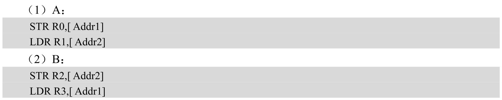 考虑以下的例子,有两个CPU(A和B),在核寄存器中保存了普通存储器内的两个地址Addr1和Addr2。每个CPU执行如代码清单6.5所示的两个指令。