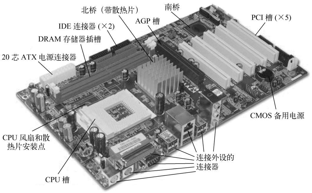 在二三十年前,构建一个嵌入式系统需要使用大量的元器件。例如,对一台个人计算机来说,其主板由大量的电子元器件、散热装置及连接器组成,如图1.1所示。