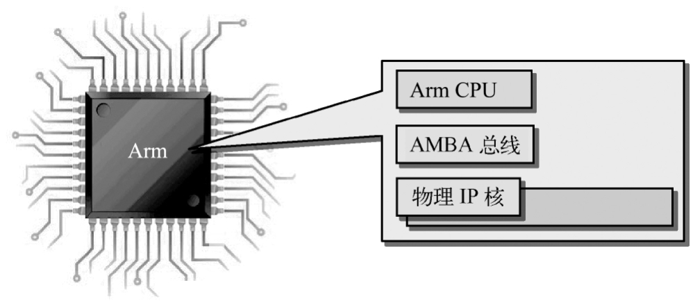 随着半导体技术的不断发展,可以将构成计算机基本结构的大量元器件集成到单个芯片中,如CPU内核、总线结构、功能丰富的外设控制器,以及模数混合元器件。例如,Arm公司向其合作伙伴提供了以Arm CPU体系结构为基础的嵌入式处理器物理知识产权(Intellectual Property,IP)核,以这个嵌入式处理器结构为核心,可以在单个芯片内搭载功能丰富的外设资源,如图1.2所示。这种将一个计算机系统集成到单个芯片中的结构称为SoC。在这种结构中,集成了Arm CPU、高级微控制器总线架构(Advanced Microcontroller Bus Architecture,AMBA)总线,以及用于和不同外设进行连接的物理IP核。
