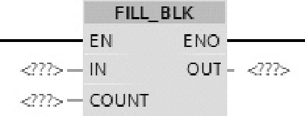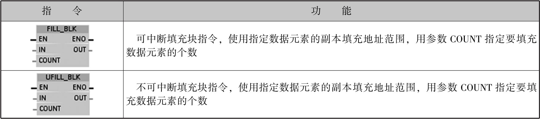 图2-67为FILL_BLK指令形式,用输入IN的值填充一个存储区域(目标区域),用输出OUT指定的起始地址填充目标区域,用参数COUNT指定填充操作的次数。