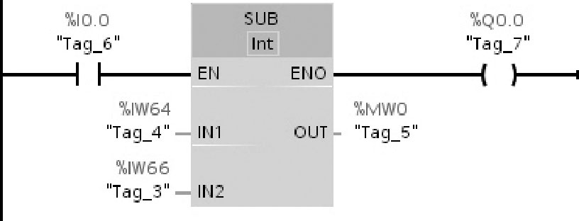 图2-53举例说明了减(SUB)指令的工作原理:如果操作数%I0.0的信号状态为“1”,则执行减(SUB)指令,从操作数%IW64的值中减去%IW66的值,并将相减结果存储在操作数%MW0中。如果减(SUB)指令执行成功,则使能输出ENO的信号状态为“1”,同时置位输出%Q0.0。