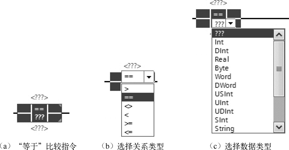 这里以“等于”比较指令为例进行说明。如图2-49(a)所示,可以使用“等于”比较指令确定第一个比较值(<操作数1>)是否等于第二个比较值(<操作数2>),通过比较指令右上角的三角选择关系类型,如图2-49(b)所示,通过右下角的三角选择数据类型,如整数、实数等,如图2-49(c)所示。