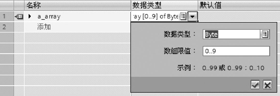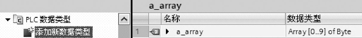 首先在TIA软件中添加新数据类型,如图2-60所示,如定义a_array为10个字节的数组,即Array[0..9]of Byte。数组的数据类型和数组限值可以通过如图2-61所示进行修改。