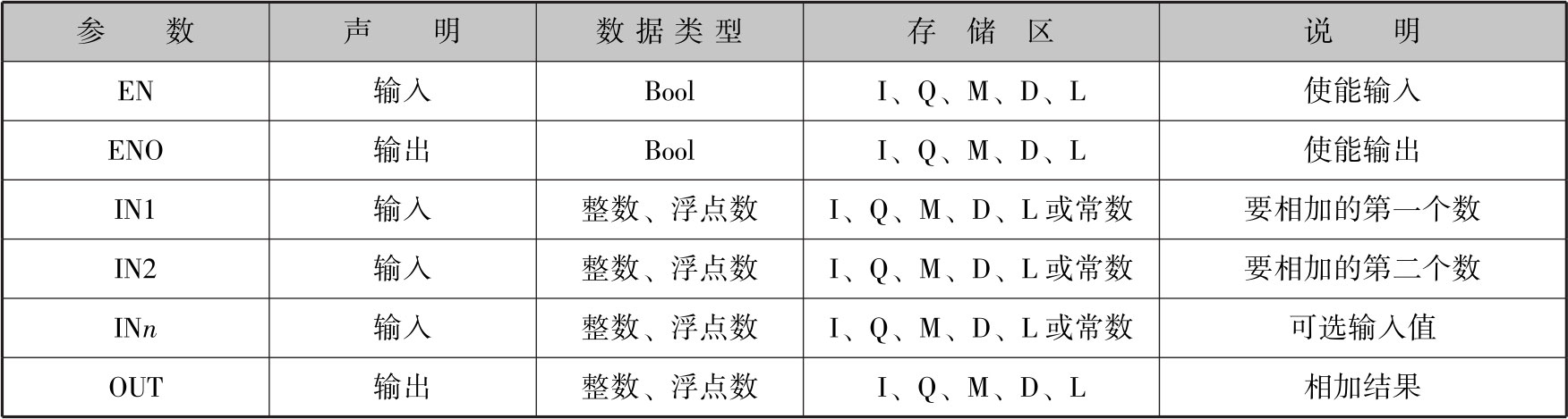 表2-22列出了加(ADD)指令的参数。根据参数说明,只有使能输入EN的信号状态为“1”时才能执行加(ADD)指令。如果成功执行了加(ADD)指令,则使能输出ENO的信号状态为“1”。如果满足下列条件之一,则使能输出ENO的信号状态为“0”: