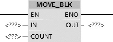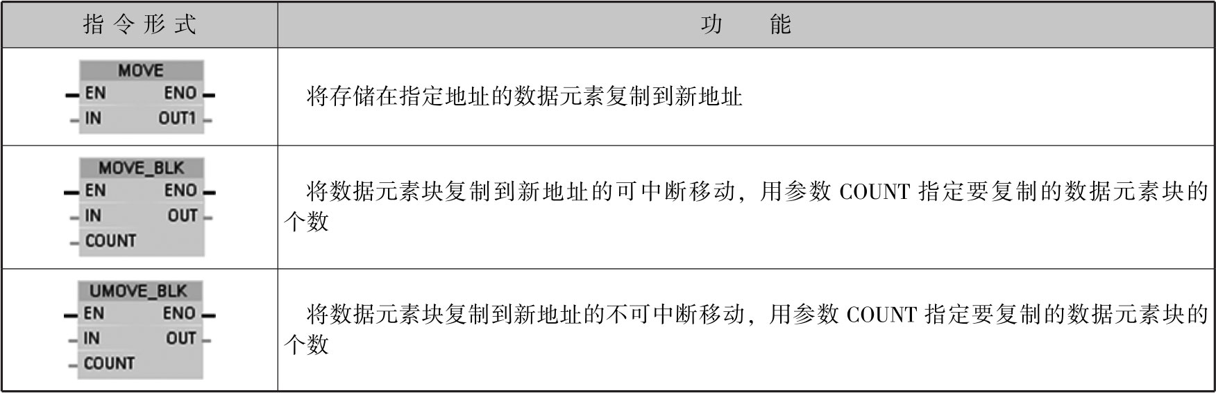 如图2-59所示,使用MOVE_BLK(块移动)指令可将存储区(源区域)中的数据元素块复制到其他存储区(目标区域),用参数COUNT指定待复制数据元素块的个数用IN输入端数据元素块的宽度指定待复制数据元素块的宽度,按地址升序执行操作。