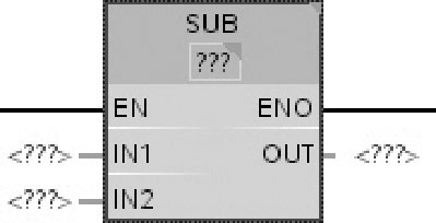 如图2-52所示,可以使用减(SUB)指令从输入IN1的值中减去输入IN2的值,并在输出OUT(OUT=IN1-IN2)处查询相减结果。减(SUB)指令的参数与加(ADD)指令的参数相同。