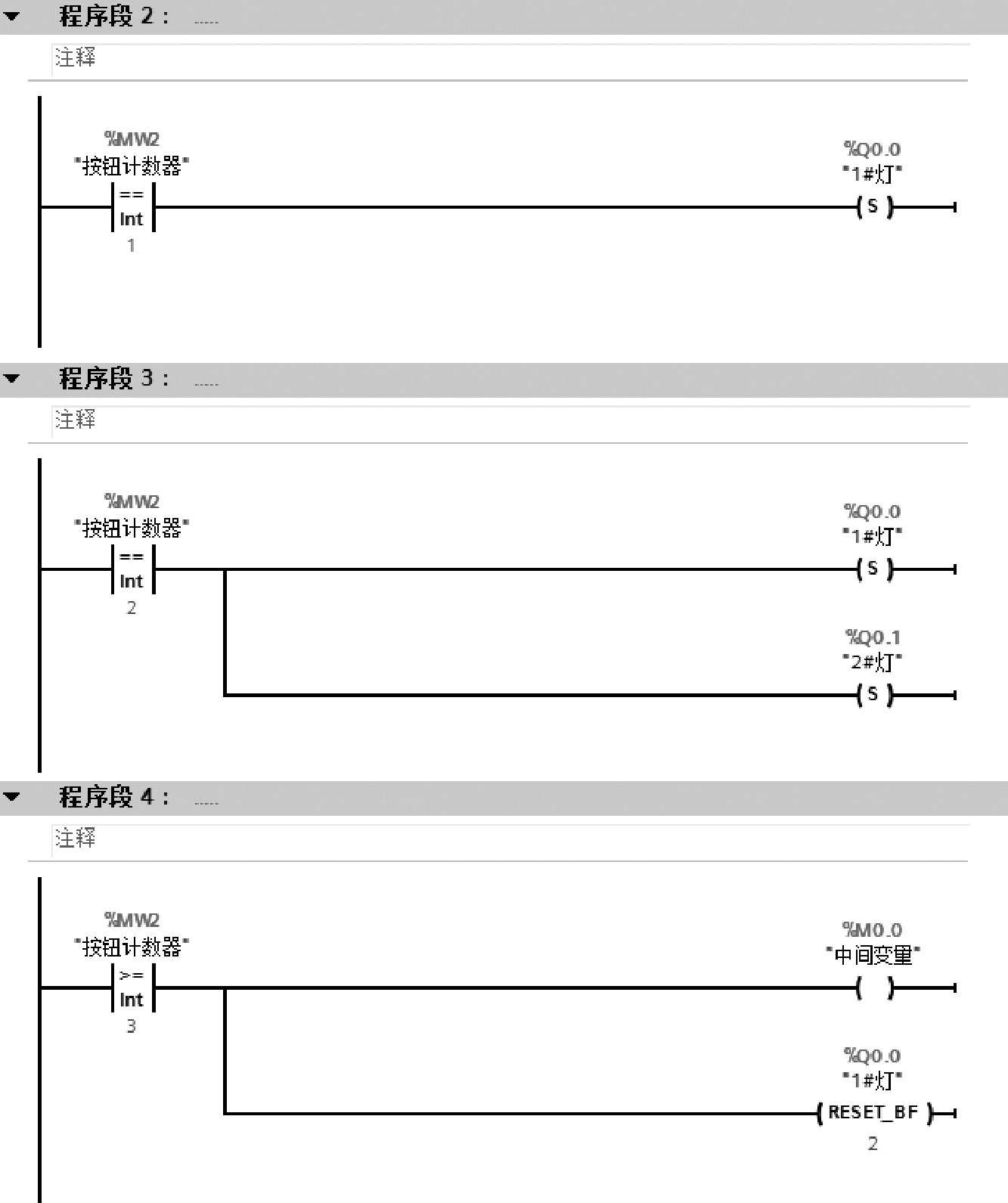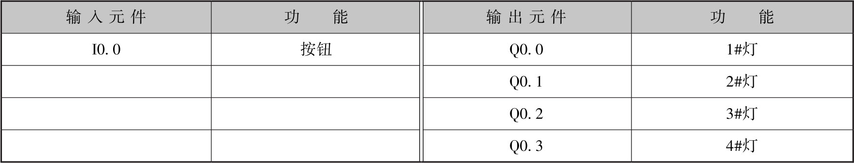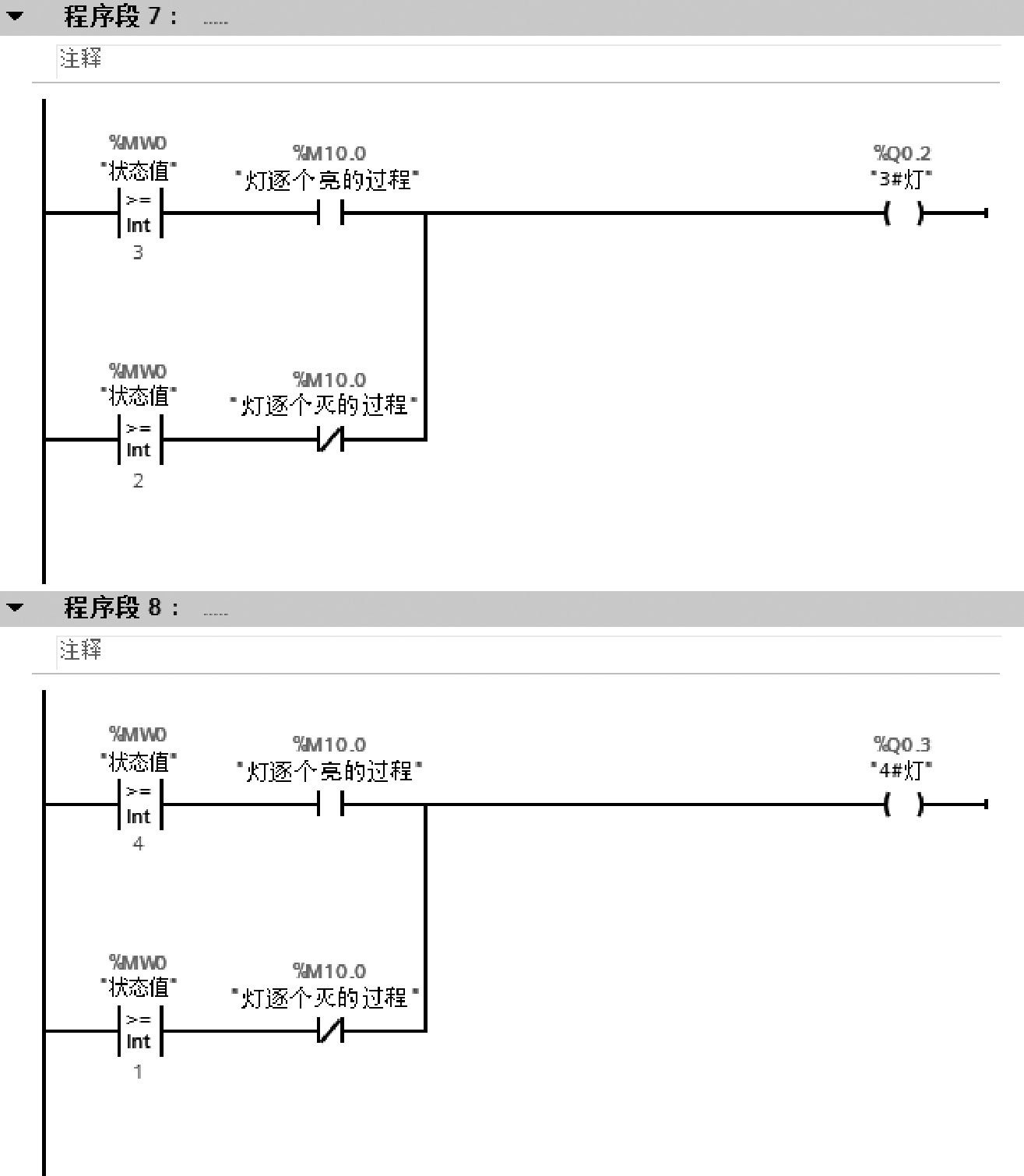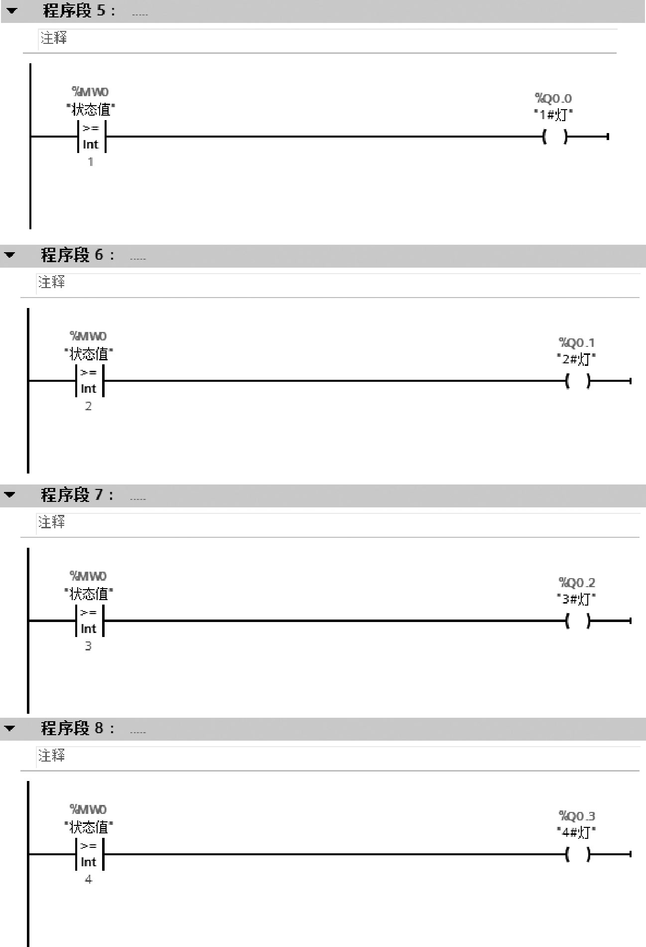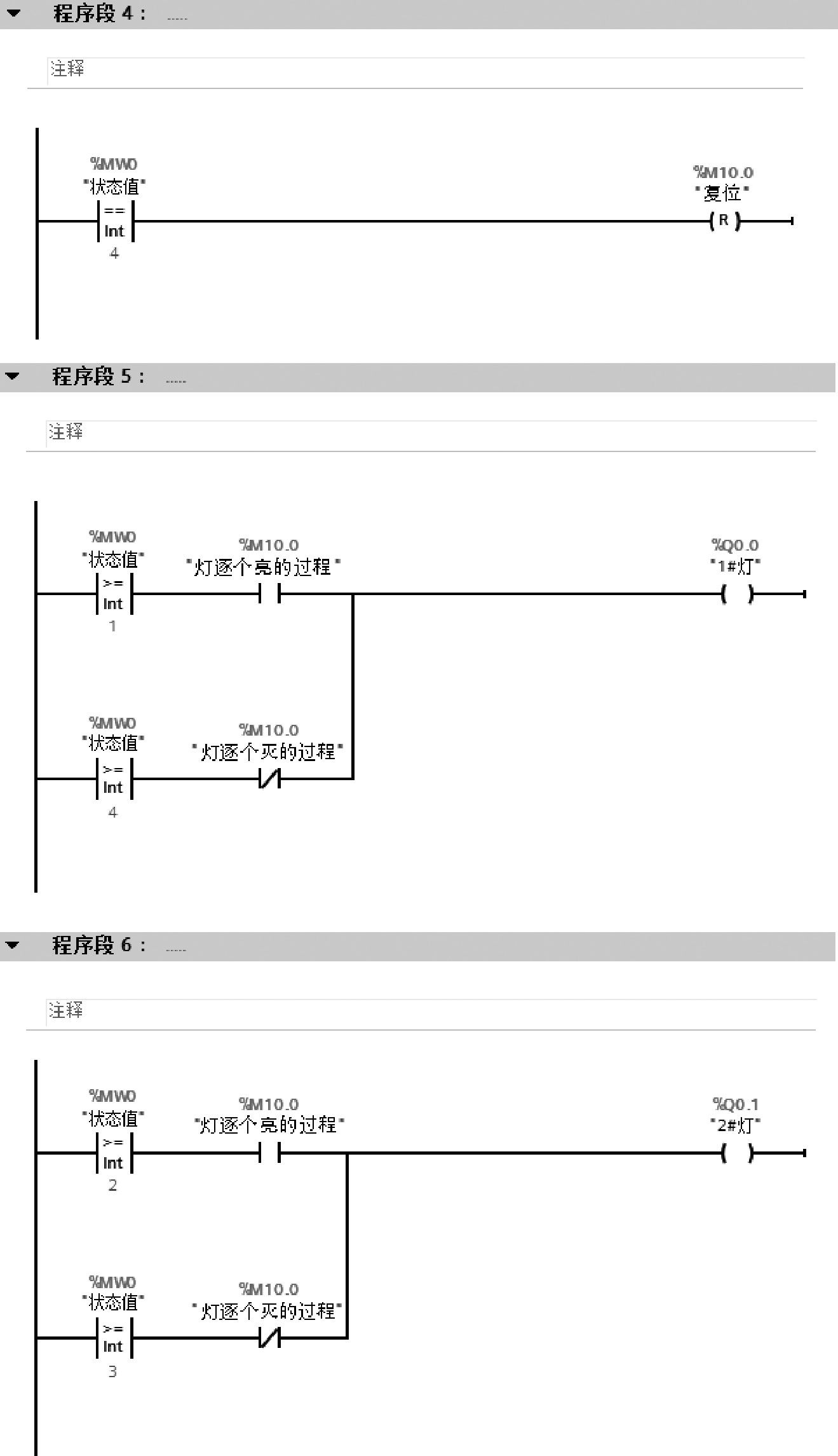 在灯逐个亮的过程中:当MW0=1时,1#灯Q0.0亮;当MW0=2时,1#灯Q0.0、2#灯Q0.1亮;当MW0=3时,1#灯Q0.0、2#灯Q0.1、3#灯Q0.2亮;当MW0=4时,1#灯Q0.0、2#灯Q0.1、3#灯Q0.2、4#灯Q0.3亮。在灯逐个灭的过程中:当MW0=3时,2#灯Q0.1、3#灯Q0.2、4#灯Q0.3亮;当MW0=2时,3#灯Q0.2、4#灯Q0.3亮;当MW0=1时,4#灯Q0.3亮;当MW0=0时,全灭。