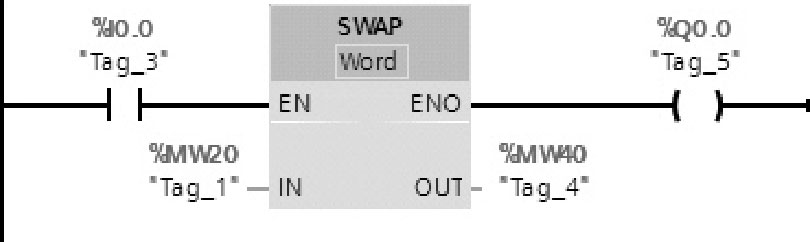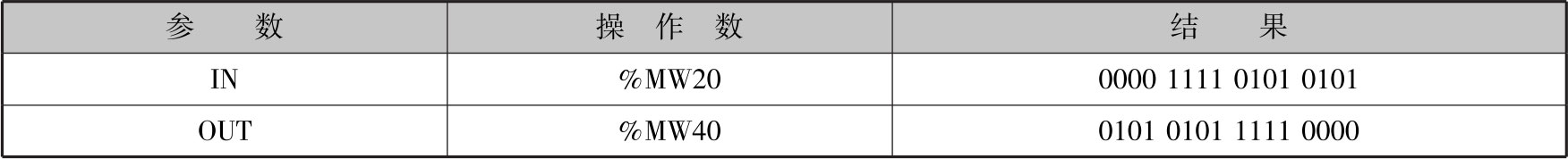 图2-69为梯形图。表2-29为执行SWAP指令后的结果。如果操作数%I0.0的信号状态为“1”,则执行SWAP指令,更换%MW20的字节顺序,并存储在操作数%MW40中。如果成功执行了SWAP指令,则输出ENO的信号状态为“1”,并置位输出%Q0.0。