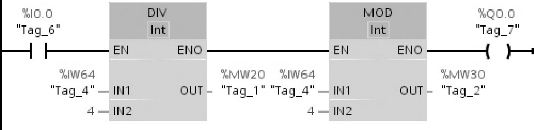 图2-57举例说明了除(DIV)指令和返回余数(MOD)指令的工作原理:如果操作数%I0.0的信号状态为“1”,则执行除(DIV)指令,用操作数%IW64的值除以操作数IN2的常数值“4”,相除后的商存储在操作数%MW20中,余数存储在操作数%MW30中。