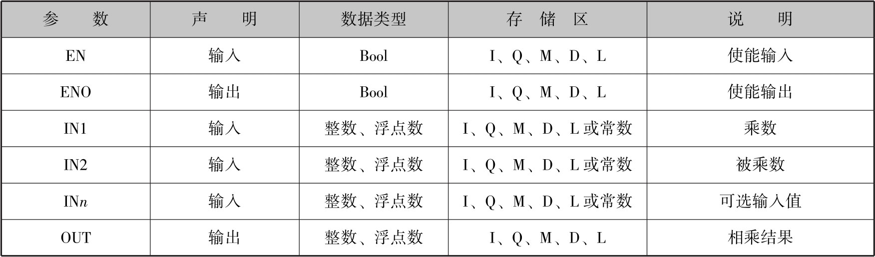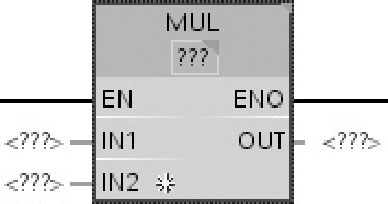 如图2-54所示,可以使用乘(MUL)指令将输入IN1的值乘以输入IN2的值,并在输出OUT(OUT=IN1*IN2)处查询相乘结果,与加(ADD)指令一样,可以在指令框中扩展输入数目,按升序对扩展的输入进行编号。表2-23为乘(MUL)指令的参数。