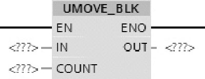 如图2-66所示,使用UMOVE_BLK(无中断块移动)指令可将存储区(源区域)中的数据元素块复制到其他存储区(目标区域),用参数COUNT指定待复制数据元素块的个数,用IN输入端数据元素块的宽度指定待复制数据元素块的宽度按地址升序执行操作。