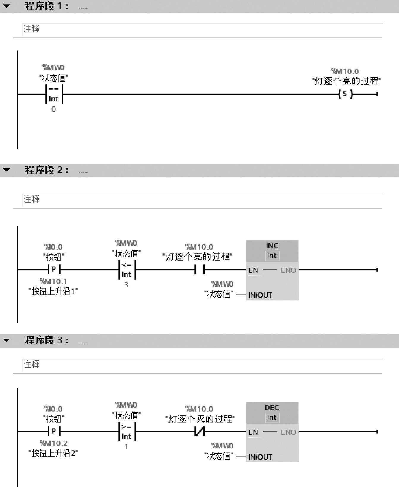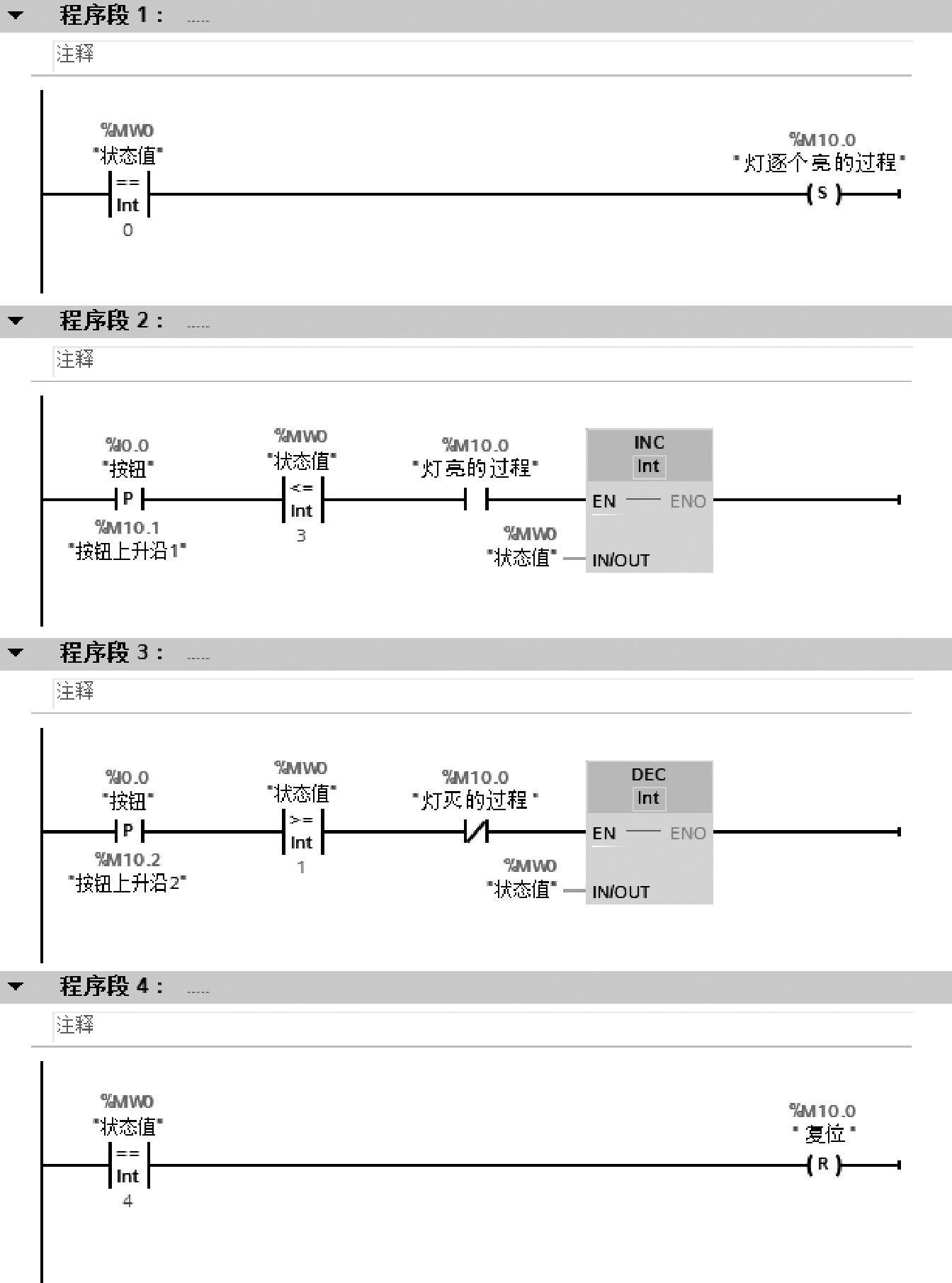 根据任务要求,设置一个状态值变量MW0,当MW0=0时开始,按下按钮,MW0依次加1(INC指令),直至MW0=4,进入灯逐个亮的过程;待MW0=4后,进入灯逐个灭的过程,此时,MW0依次减1(DEC指令),直至MW0=0,进行下一个循环。
