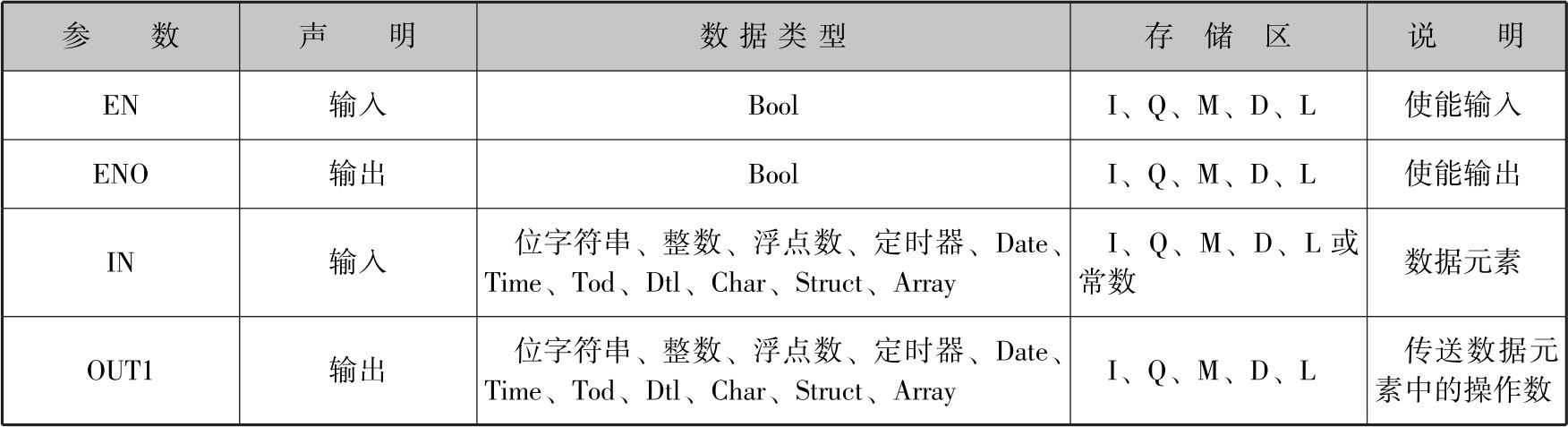 MOVE只有在使能输入EN的信号状态为“1”时才能够执行。在这种情况下,输出ENO的信号状态为“1”。若EN的信号状态为“0”,则将ENO使能输出复位为“0”。