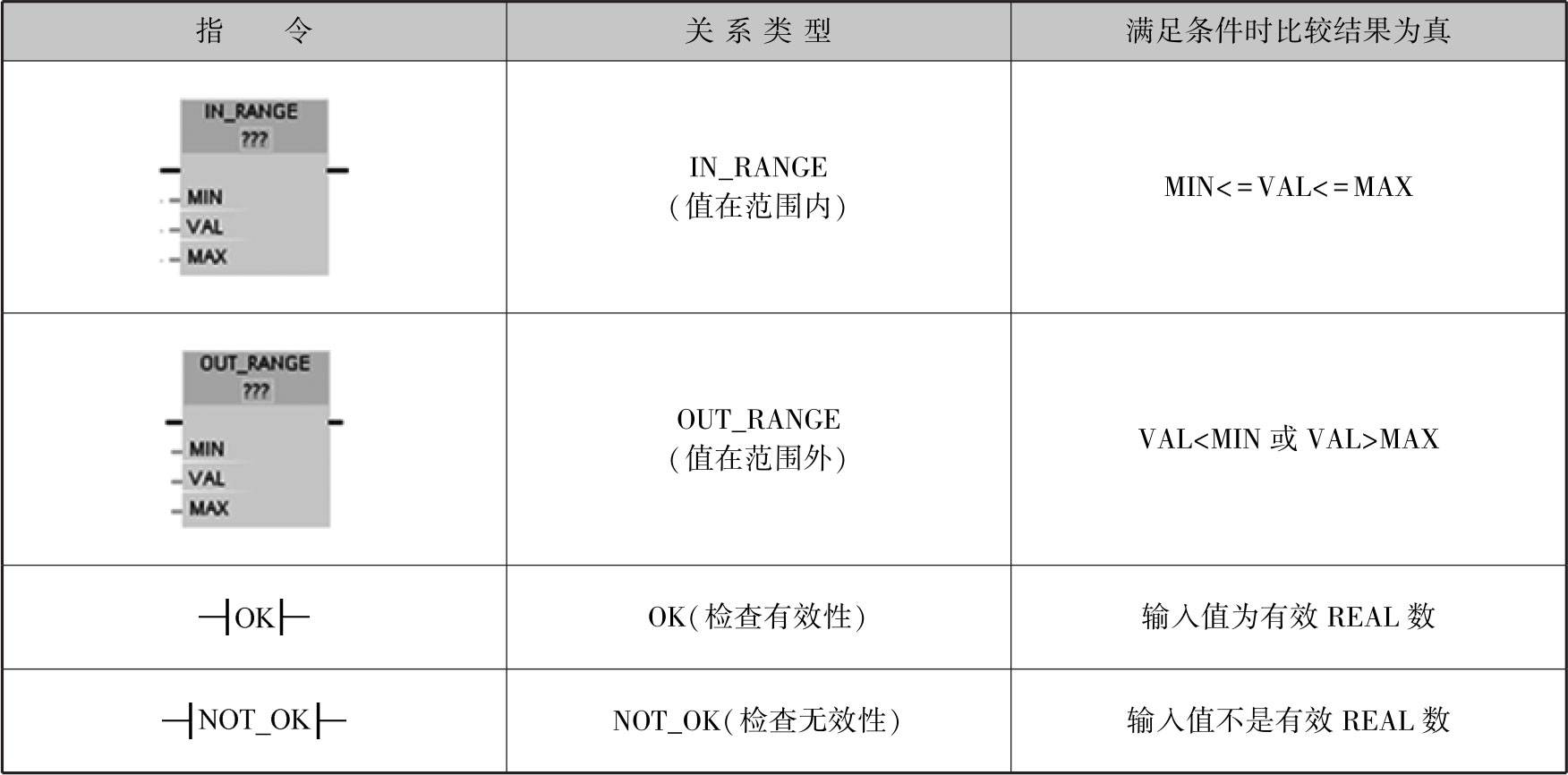 表2-21为值在范围内、值在范围外、检查有效性、检查无效性等4种比较指令的满足条件。